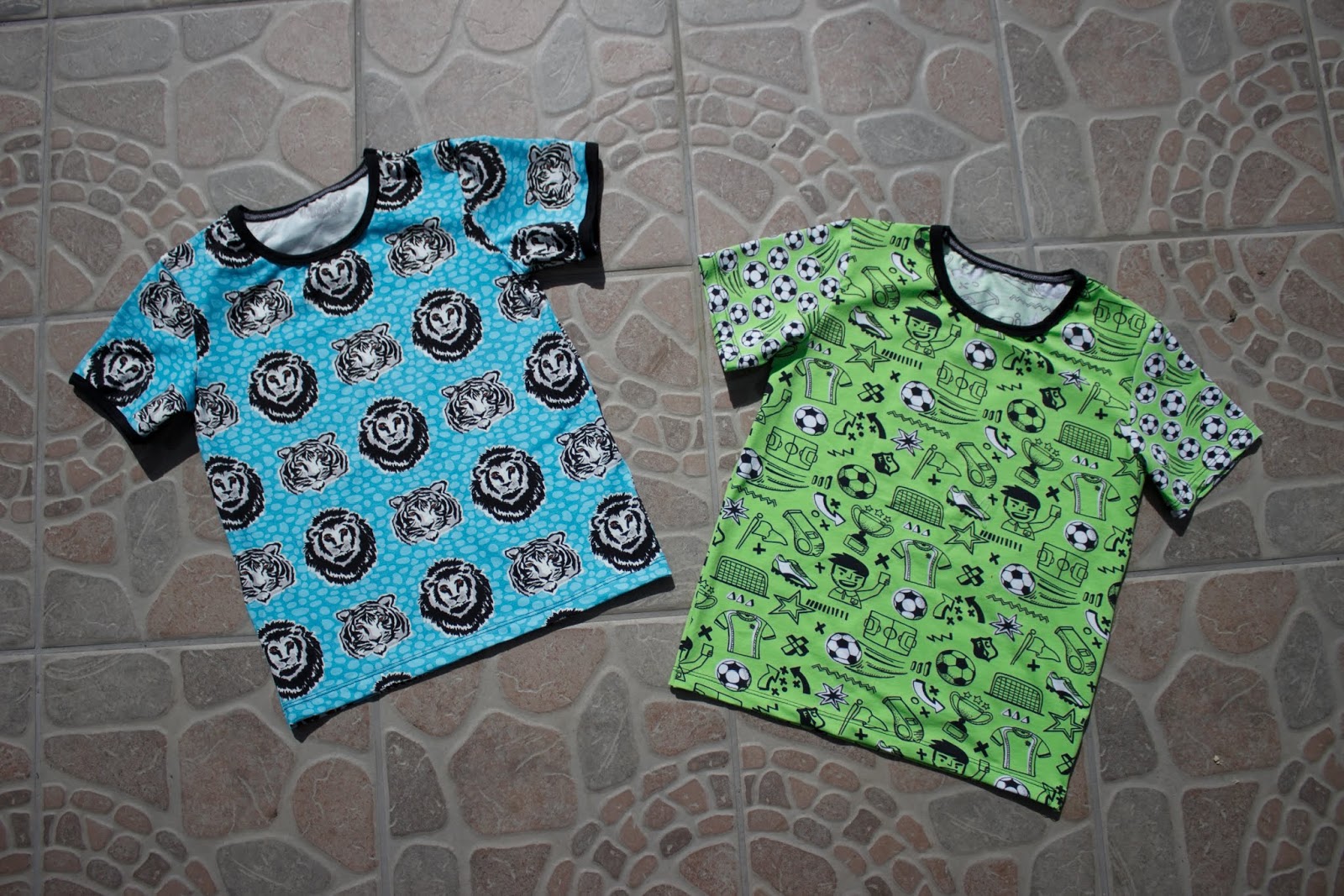 Für das Großkind habe ich ein neuen T-Shirt Lieblingsschnitt. Das geniale daran ist, dass man es auch mit Kapuze und mit Teilungen nähen kann. Da ich das im Sommer aber nicht immer so praktisch finde, gibt's erstmal zweimal die einfache Variante ohne Kapuze.